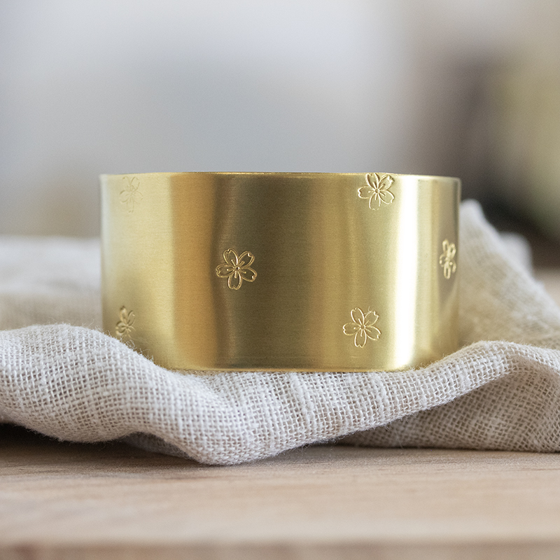 Un joli rond de serviette en laiton avec des fleurs de monoï, gravé et façonné à la main.