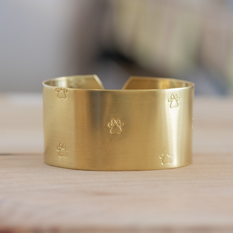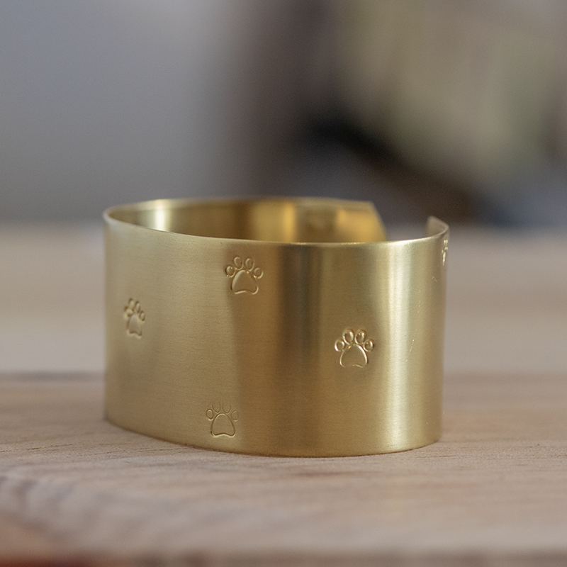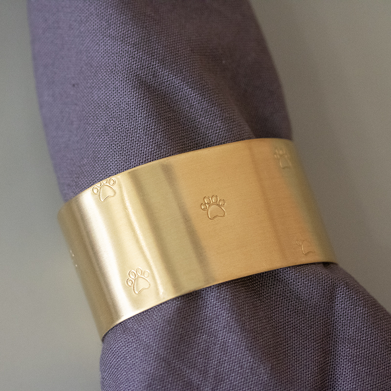 Un joli rond de serviette en laiton avec de mignonnes petites empreintes de pattes, gravé et façonné à la main.